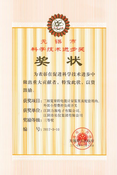 据无锡市科学技术局信息,由我公司和集团公司共同申报的“三相宽量程电能计量装置及配套用内、外置小型负荷开关"正式被评为无锡市2017年科学进步奖, 并颁发了荣誉证书。这是我我公司相关产品 继去年获得江阴市科技进步奖之后的又一次更高级别科技殊荣。同时爱游戏平台也祝愿力源电子在日益激烈的科研市场上能进一步埋头苦干、真抓实干,取得更好的科研成果。